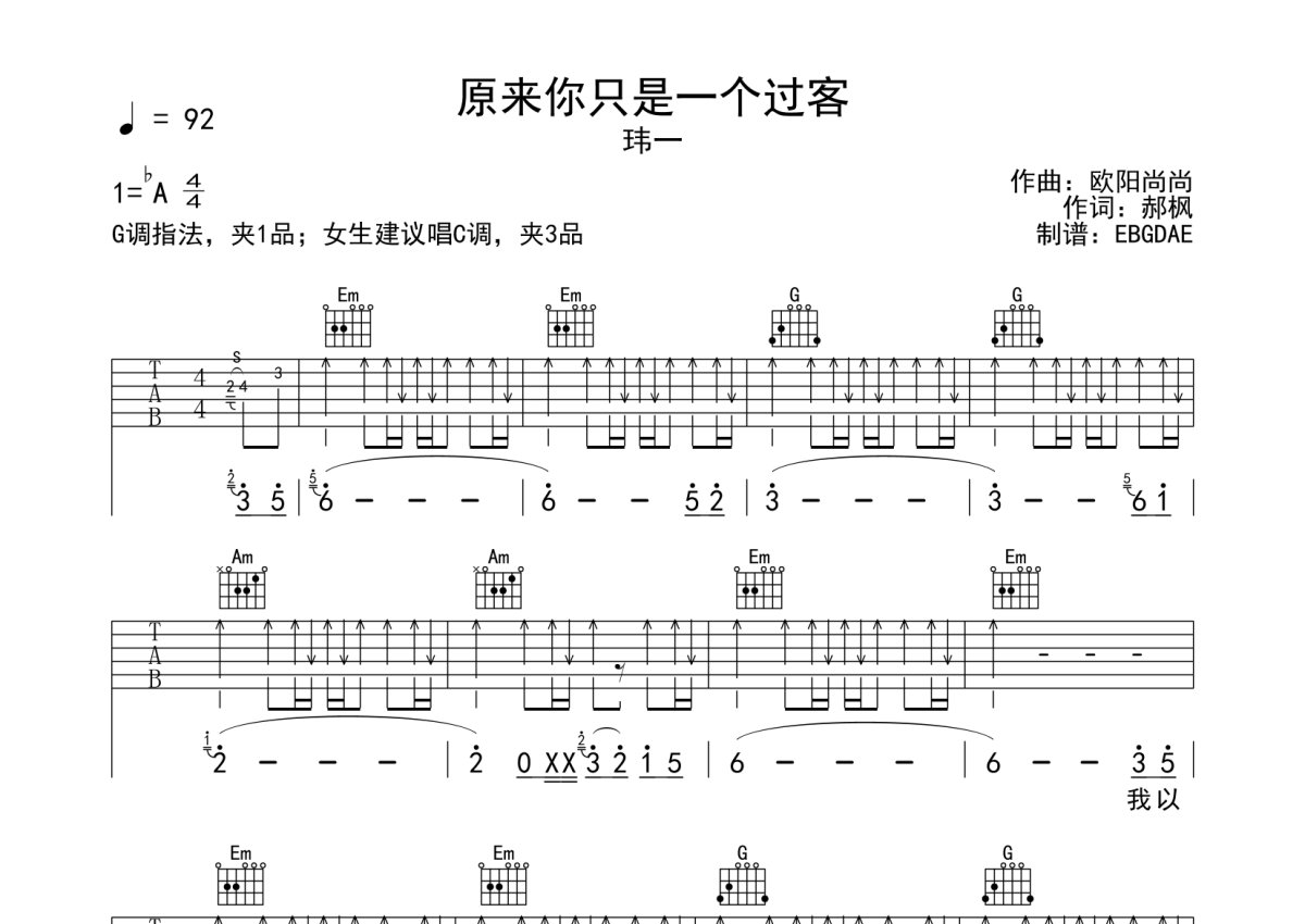 《原来你只是一个过客》是玮一演唱的一首歌曲,本吉他谱采用的是G调指法编配,这份吉他谱共有三张高清图谱,图谱由 @EBGDAE 编配上传,图谱使用六线谱编配,包含吉他和弦指法、简谱以及歌词部分,使用这份原来你只是一个过客吉他谱,可以让你更加方便地掌握这首歌曲的弹唱技巧,快来尝试吧。物美价廉,请放心选购!感谢您的关注,我们共同进步!。