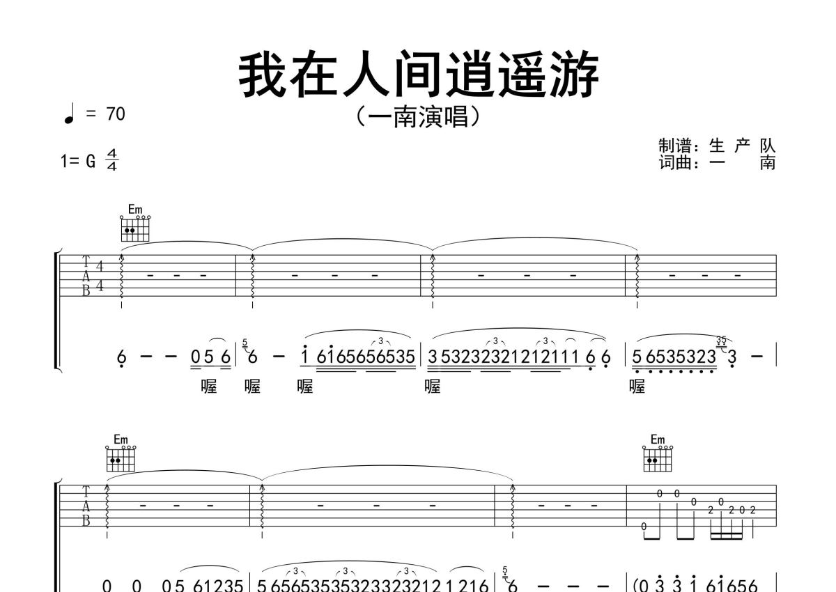 《我在人间逍遥游》是一南演唱的一首歌曲,精编完美版,拍号为2/4拍,歌曲速度为每分钟70拍,歌曲原调为G调,本吉他谱采用的是G调指法编配,演奏时不需要使用变调夹即为原调,这份吉他谱共有三张高清图谱,图谱由 @生产队 编配上传,图谱使用六线谱编配,包含吉他和弦指法、简谱以及歌词部分,使用这份我在人间逍遥游吉他谱,可以让你更加方便地掌握这首歌曲的弹唱技巧,快来尝试吧。一南演唱的歌曲《我在人间逍遥游》原版吉他谱,含精准的前奏、间奏、尾奏solo编配,精编完美版,优质推荐!。