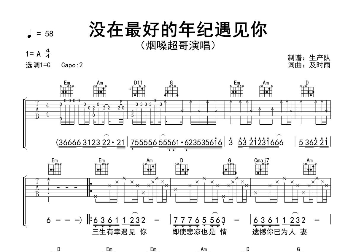 《没在最好的年纪遇见你》是烟嗓超哥演唱的一首歌曲,精编完美版,拍号为4/4拍,歌曲速度为每分钟58拍,歌曲原调为A调,但由于原调指法比较难,为了方便弹奏,本吉他谱采用的是G调指法编配,变调夹2品弹奏即为原调,当然也可以根据自己的音域改变变调夹位置,或者通过改变和弦调性,以方便自己弹奏,这份吉他谱共有两张高清图谱,图谱由 @生产队 编配上传,图谱使用六线谱编配,包含吉他和弦指法、简谱以及歌词部分,使用这份没在最好的年纪遇见你吉他谱,可以让你更加方便地掌握这首歌曲的弹唱技巧,快来尝试吧。烟嗓超哥演唱的歌曲《没在最好的年纪遇见你》原版吉他谱,含精准的前奏、间奏solo编配,精编完美版,优质推荐!。