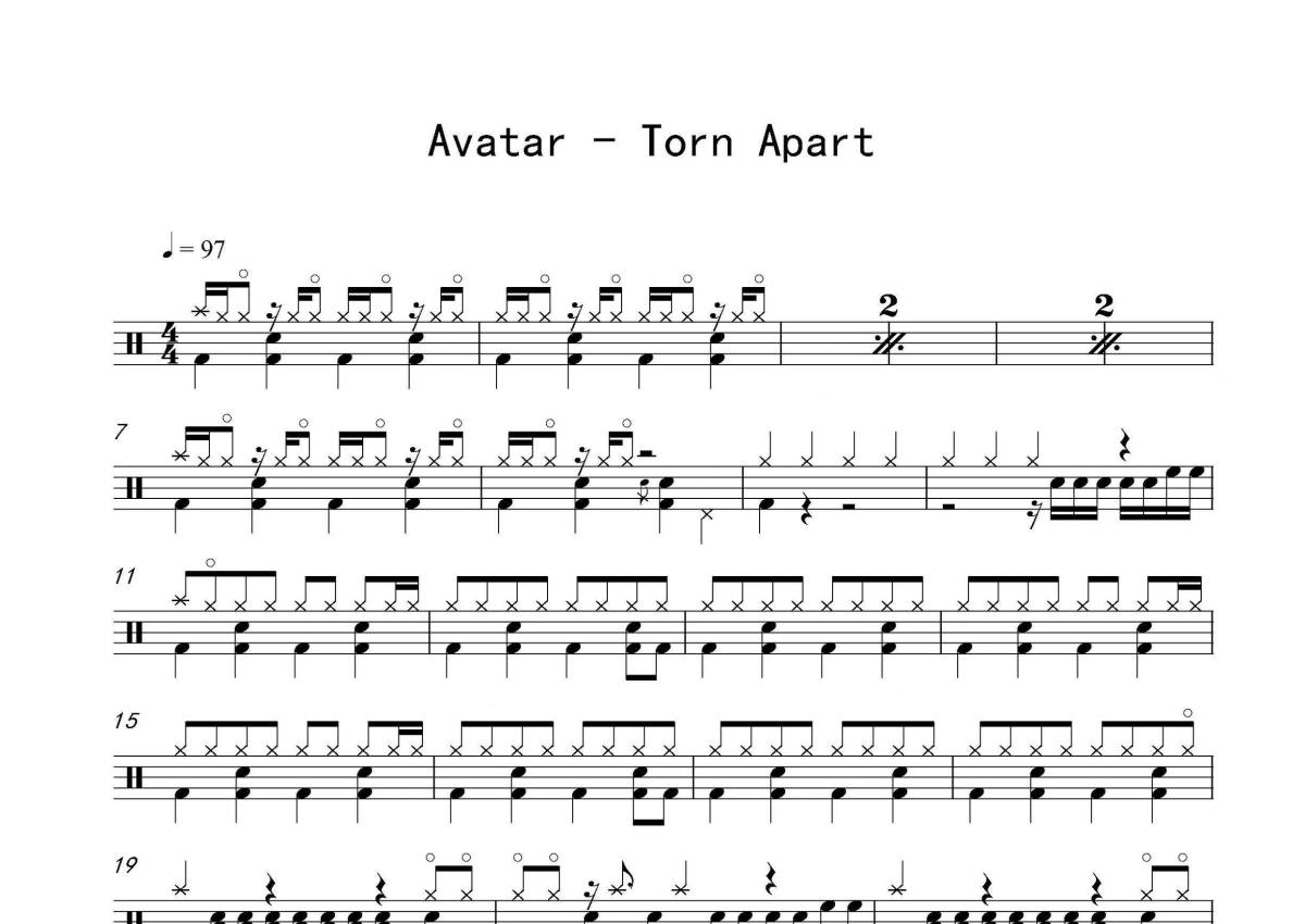 《Torn Apart》是Avatar演唱的一首歌曲,拍号为4/4拍,歌曲速度为每分钟97拍,这份架子鼓谱共有三张高清图谱,图谱由 @音符喷血者 编配上传,图谱使用五线谱编配,使用这份Torn Apart架子鼓谱,你将能够轻松地敲打出这首Avatar的Torn Apart,快来尝试吧。