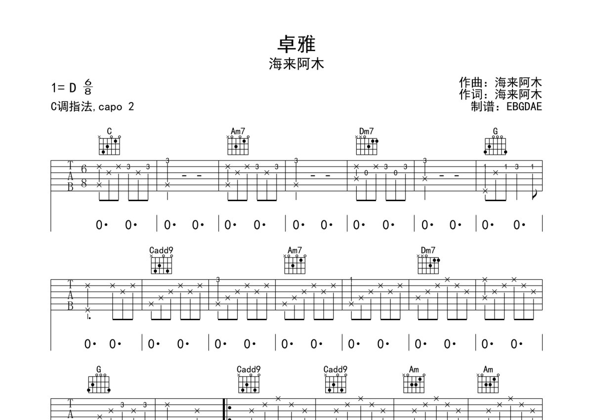 海来阿木《卓雅》吉他谱 - C调弹唱六线谱