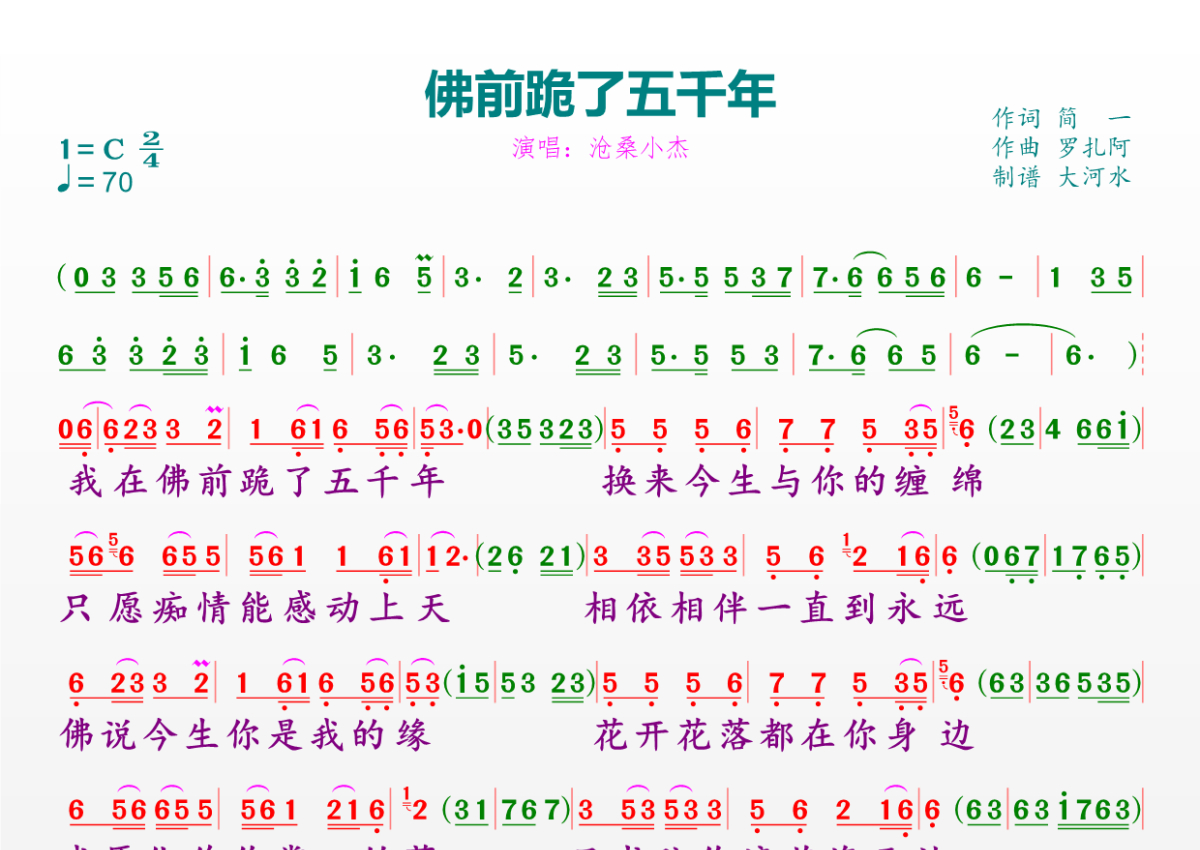 《佛前跪了五千年》是沧桑小杰演唱的一首歌曲,拍号为4/4拍,歌曲速度为每分钟70拍,这份简谱共有一张高清图谱,图谱由 @临海雪原 编配上传。