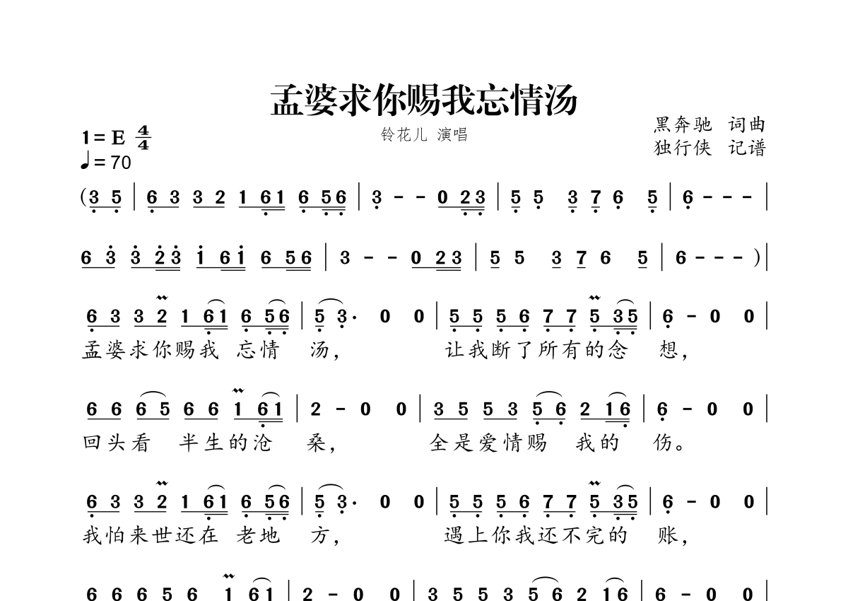 《孟婆求你赐我忘情汤》是铃花儿演唱的一首歌曲,拍号为4/4拍,歌曲速度为每分钟70拍,这份简谱共有一张高清图谱,图谱由 @独行侠 编配上传。