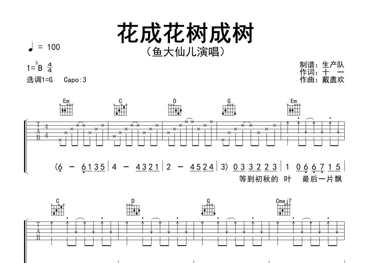《花成花树成树》是鱼大仙儿演唱的一首歌曲,精编完美版,拍号为4/4拍,歌曲速度为每分钟100拍,歌曲原调为Bb调,但由于原调指法比较难,为了方便弹奏,本吉他谱采用的是G调指法编配,变调夹3品弹奏即为原调,当然也可以根据自己的音域改变变调夹位置,或者通过改变和弦调性,以方便自己弹奏,这份吉他谱共有三张高清图谱,图谱由 @生产队 编配上传,图谱使用六线谱编配,包含吉他和弦指法、简谱以及歌词部分,使用这份花成花树成树吉他谱,可以让你更加方便地掌握这首歌曲的弹唱技巧,快来尝试吧。鱼大仙儿演唱的歌曲《花成花树成树》原版吉他谱,含精准的前奏、间奏、尾奏solo编配,精编完美版,优质推荐!。