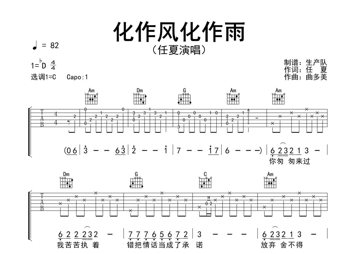 任夏《化作风化作雨》吉他谱 - C调弹唱六线谱 - 精编完美版