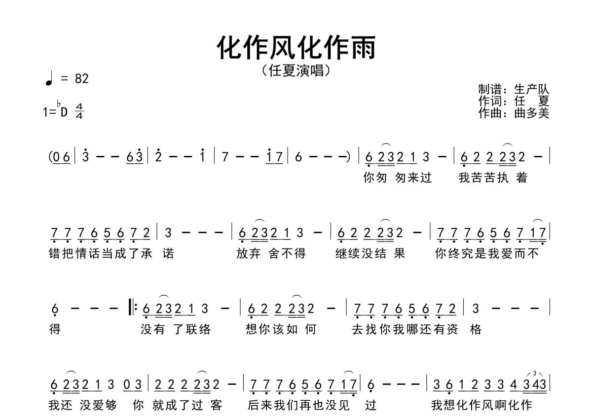 《化作风化作雨》是任夏演唱的一首歌曲,原版简谱,拍号为4/4拍,歌曲速度为每分钟82拍,这份简谱共有一张高清图谱,图谱由 @生产队 编配上传任夏演唱的歌曲《化作风化作雨》原版简谱,含精准的前奏、间奏、尾奏solo编配,精编完美版,优质推荐!。