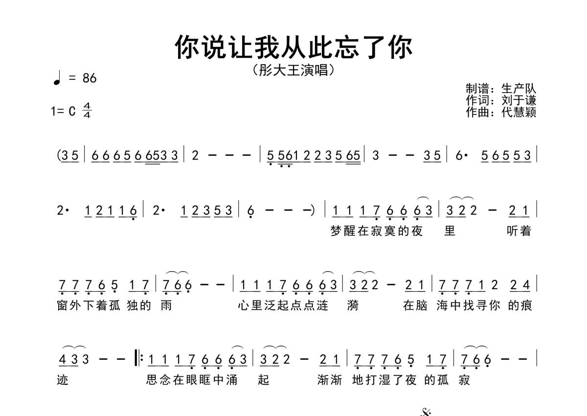 《你说让我从此忘了你》是彤大王演唱的一首歌曲,原版简谱,这份简谱共有一张高清图谱,图谱由 @生产队 编配上传彤大王演唱的歌曲《你说让我从此忘了你》原版简谱,含精准的前奏、间奏solo编配,精编完美版,优质推荐!。