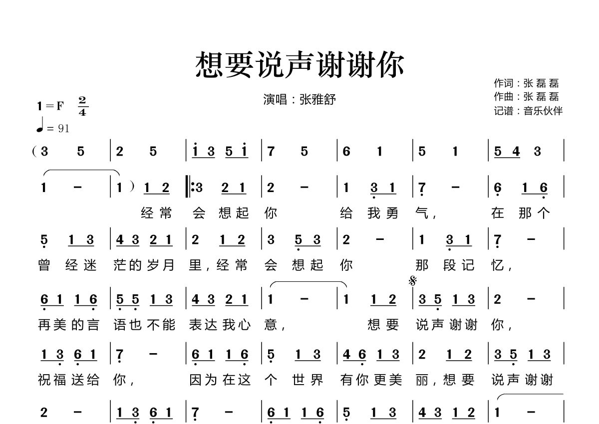 《想要说声谢谢你》是张雅舒演唱的一首歌曲,拍号为2/4拍,歌曲速度为每分钟91拍,这份简谱共有一张高清图谱,图谱由 @音乐伙伴 编配上传。