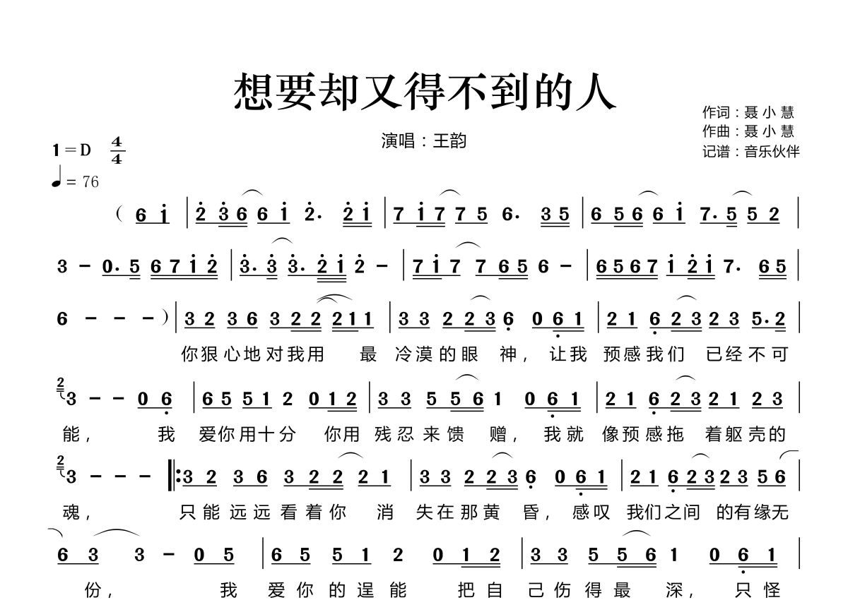 《想要却又得不到的人》是王韵演唱的一首歌曲,拍号为4/4拍,歌曲速度为每分钟76拍,这份简谱共有一张高清图谱,图谱由 @音乐伙伴 编配上传。
