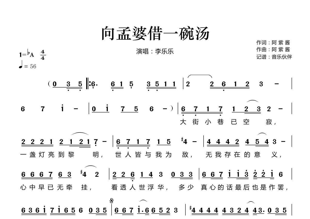 向孟婆借一碗汤简谱 - 李乐乐演唱