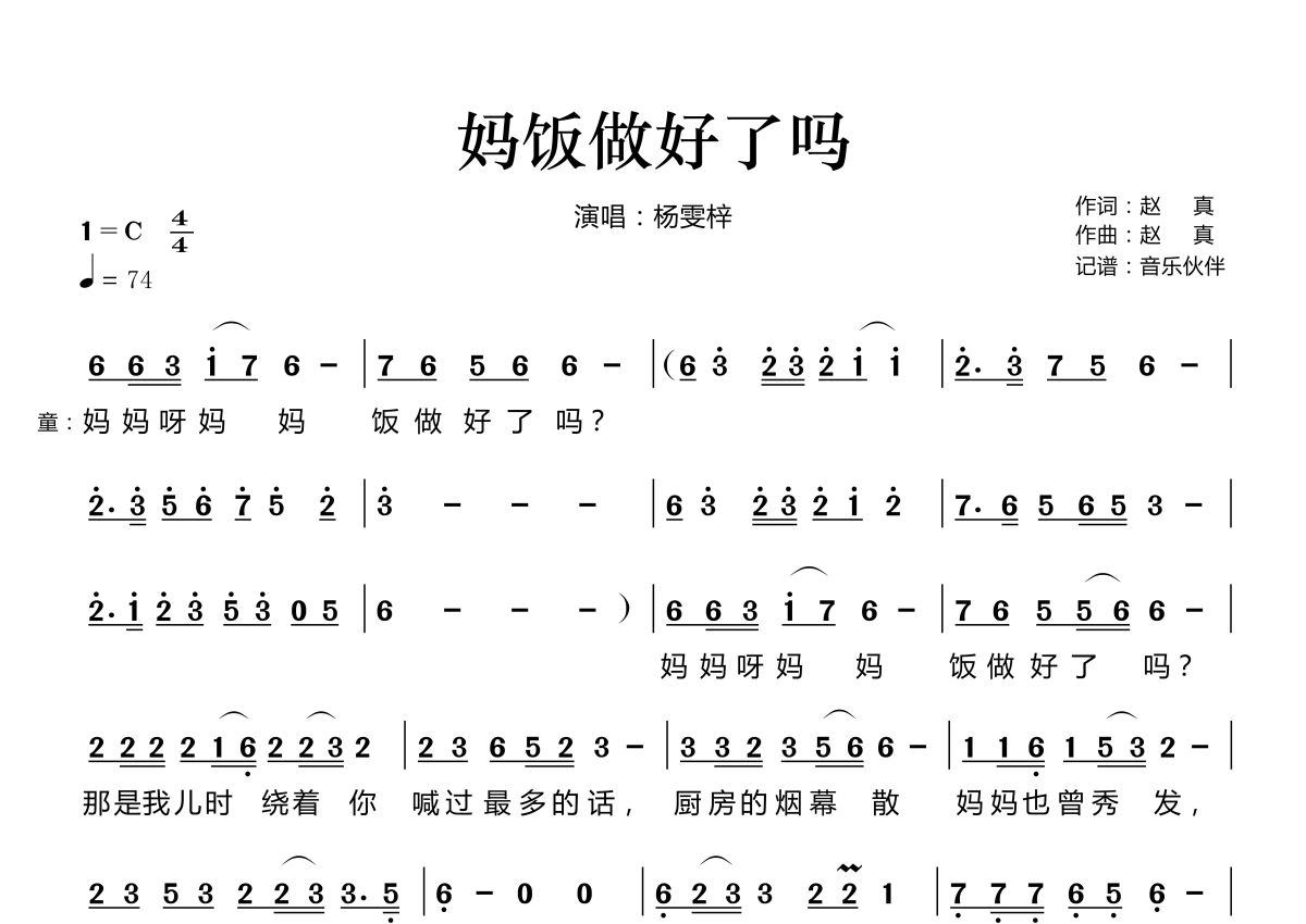 《妈饭做好了吗》是杨雯梓演唱的一首歌曲,拍号为4/4拍,歌曲速度为每分钟74拍,这份简谱共有两张高清图谱,图谱由 @音乐伙伴 编配上传。