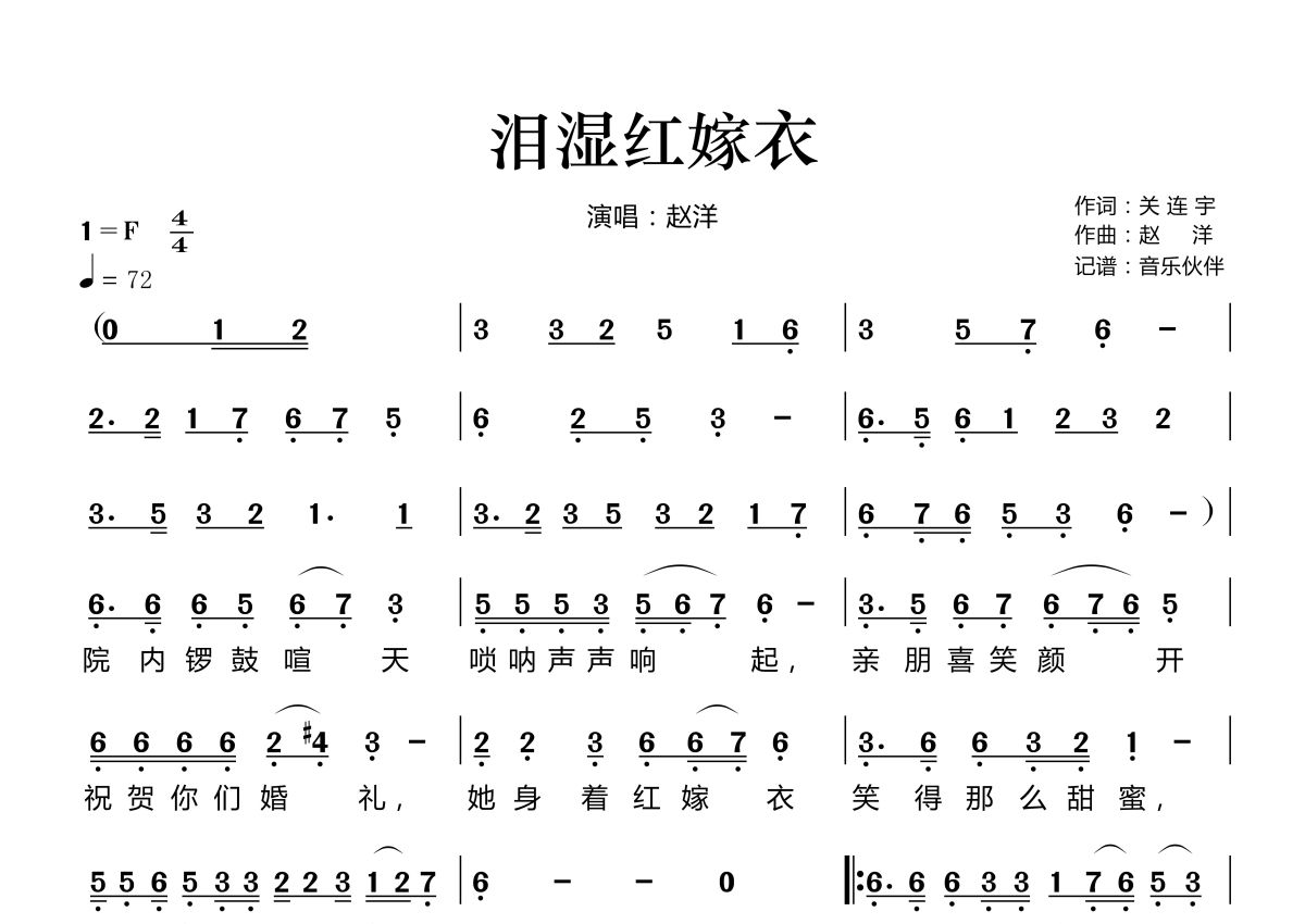 《泪湿红嫁衣》是赵洋演唱的一首歌曲,拍号为4/4拍,歌曲速度为每分钟72拍,这份简谱共有两张高清图谱,图谱由 @音乐伙伴 编配上传。