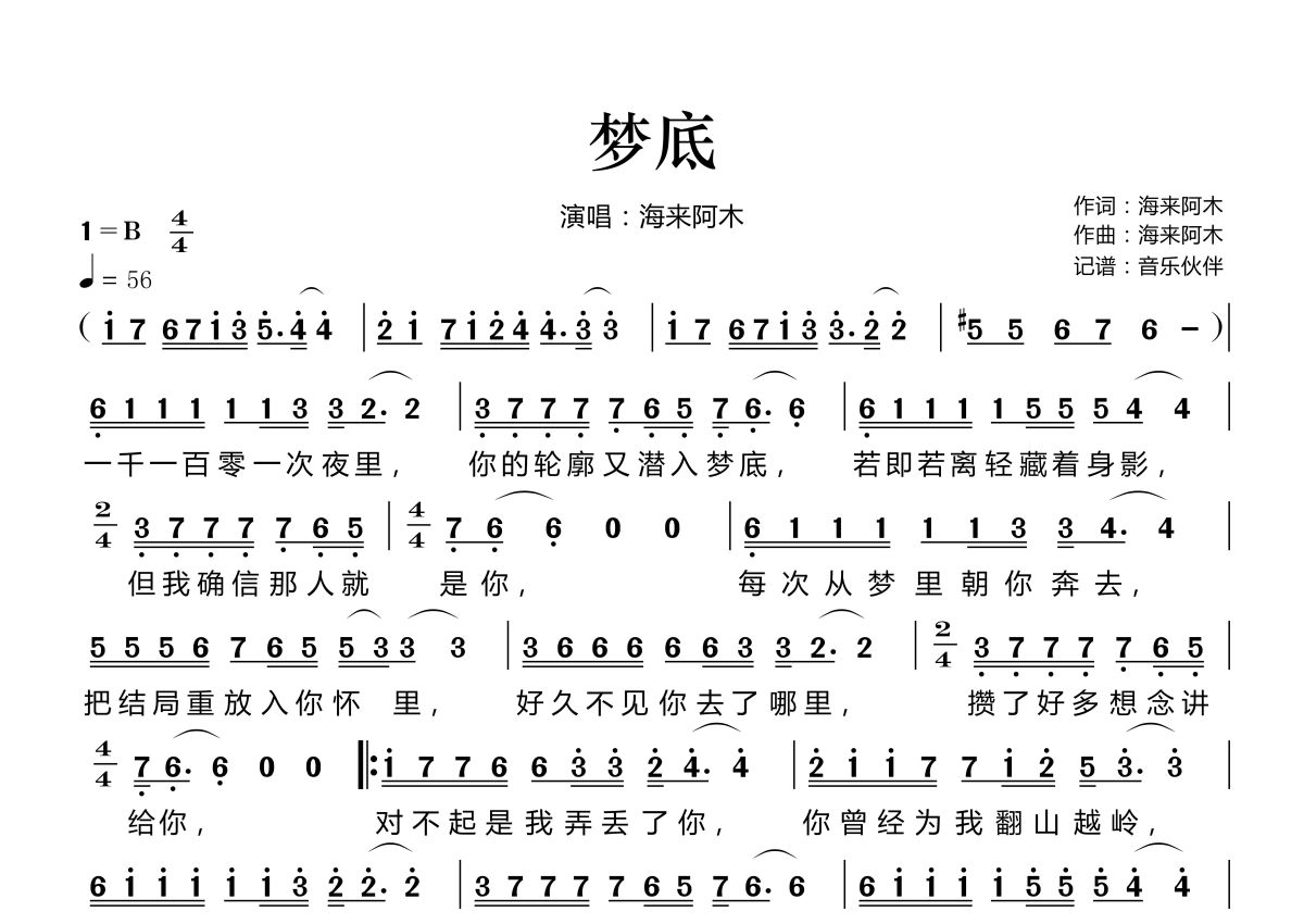 《梦底》简谱 - 海来阿木 - 音乐伙伴编配