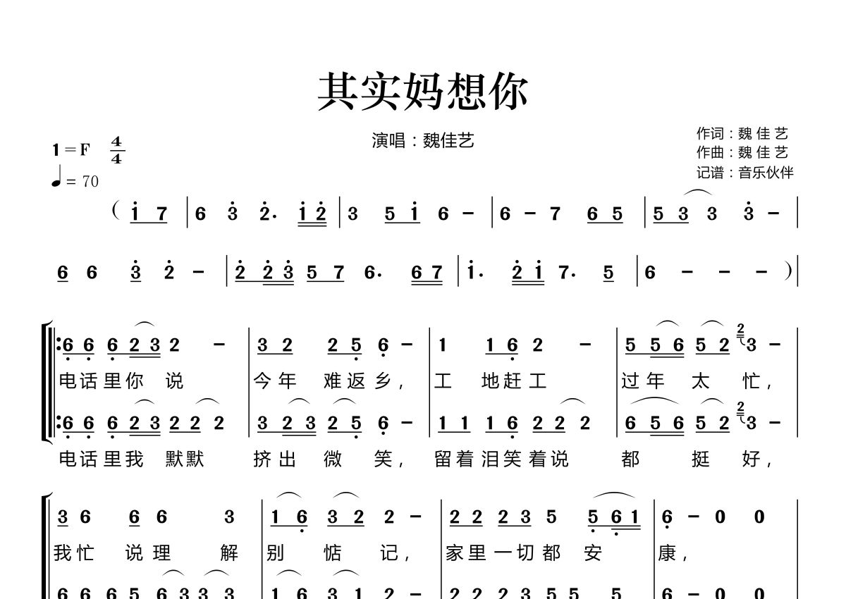 《其实妈想你》是魏佳艺演唱的一首歌曲,拍号为4/4拍,歌曲速度为每分钟70拍,这份简谱共有两张高清图谱,图谱由 @音乐伙伴 编配上传。