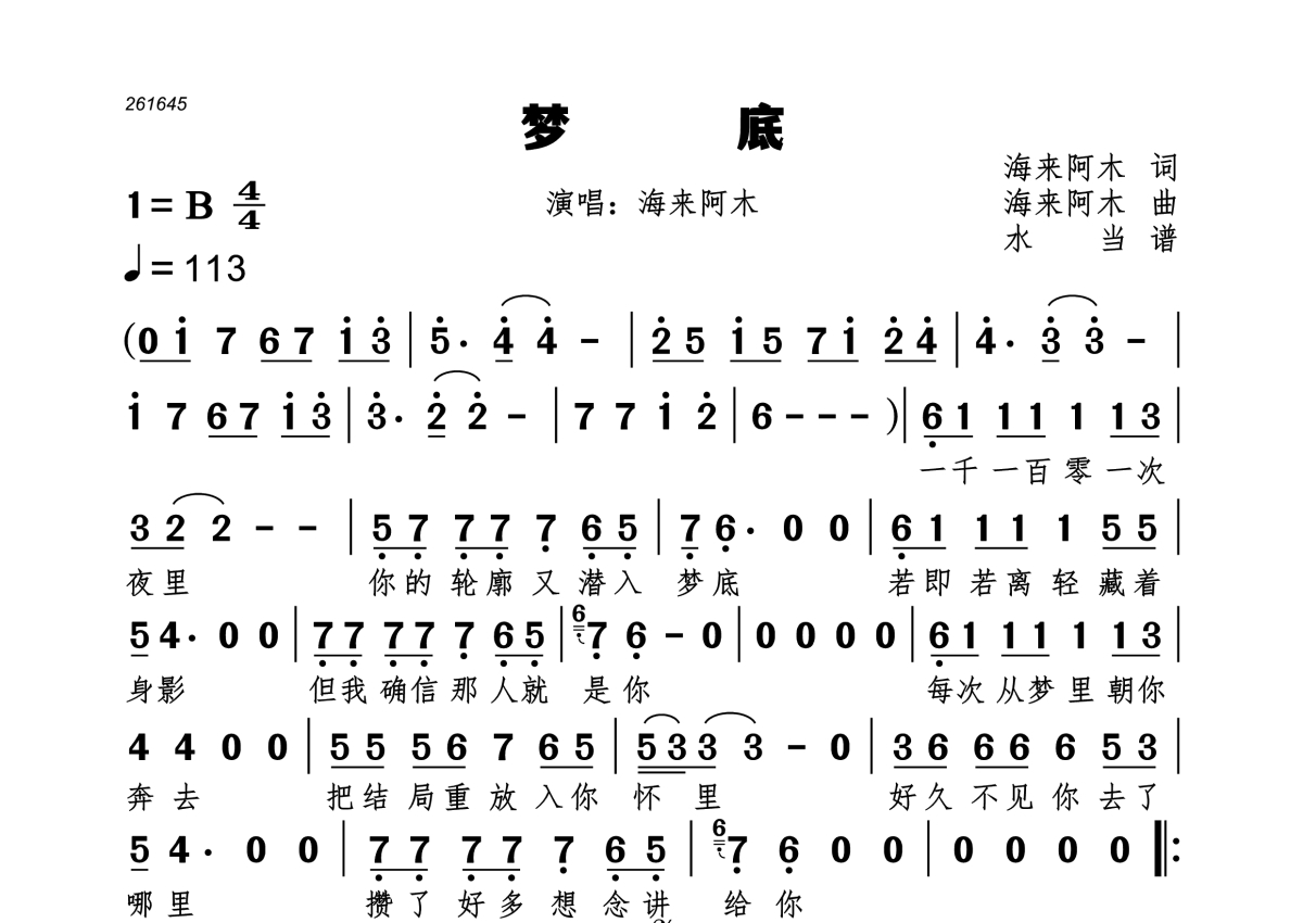 《梦底》是海来阿木演唱的一首歌曲,拍号为4/4拍,歌曲速度为每分钟113拍,这份简谱共有一张高清图谱,图谱由 @水当 编配上传。