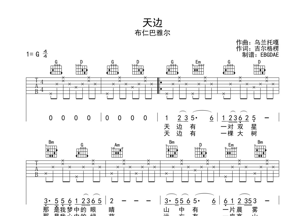 布仁巴雅尔《天边》吉他谱 - G调弹唱六线谱