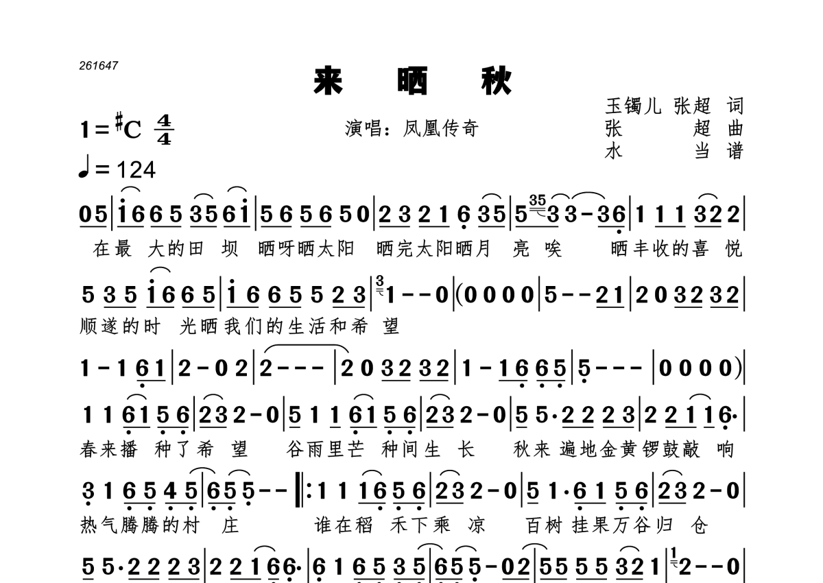 《来晒秋》是凤凰传奇演唱的一首歌曲,拍号为4/4拍,歌曲速度为每分钟124拍,这份简谱共有一张高清图谱,图谱由 @水当 编配上传。