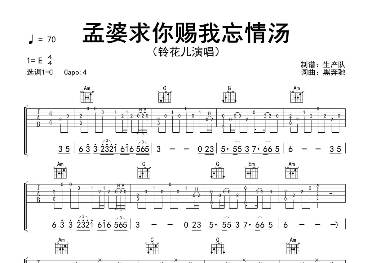 《孟婆求你赐我忘情汤》是铃花儿铃花儿演唱的一首歌曲,精编完美版,拍号为4/4拍,歌曲速度为每分钟70拍,歌曲原调为E调,但由于原调指法比较难,为了方便弹奏,本吉他谱采用的是C调指法编配,变调夹4品弹奏即为原调,当然也可以根据自己的音域改变变调夹位置,或者通过改变和弦调性,以方便自己弹奏,这份吉他谱共有两张高清图谱,图谱由 @生产队 编配上传,图谱使用六线谱编配,包含吉他和弦指法、简谱以及歌词部分,使用这份孟婆求你赐我忘情汤吉他谱,可以让你更加方便地掌握这首歌曲的弹唱技巧,快来尝试吧。铃花儿演唱的歌曲《孟婆求你赐我忘情汤》原版吉他谱,含精准的前奏、尾奏solo编配,精编完美版,优质推荐!。