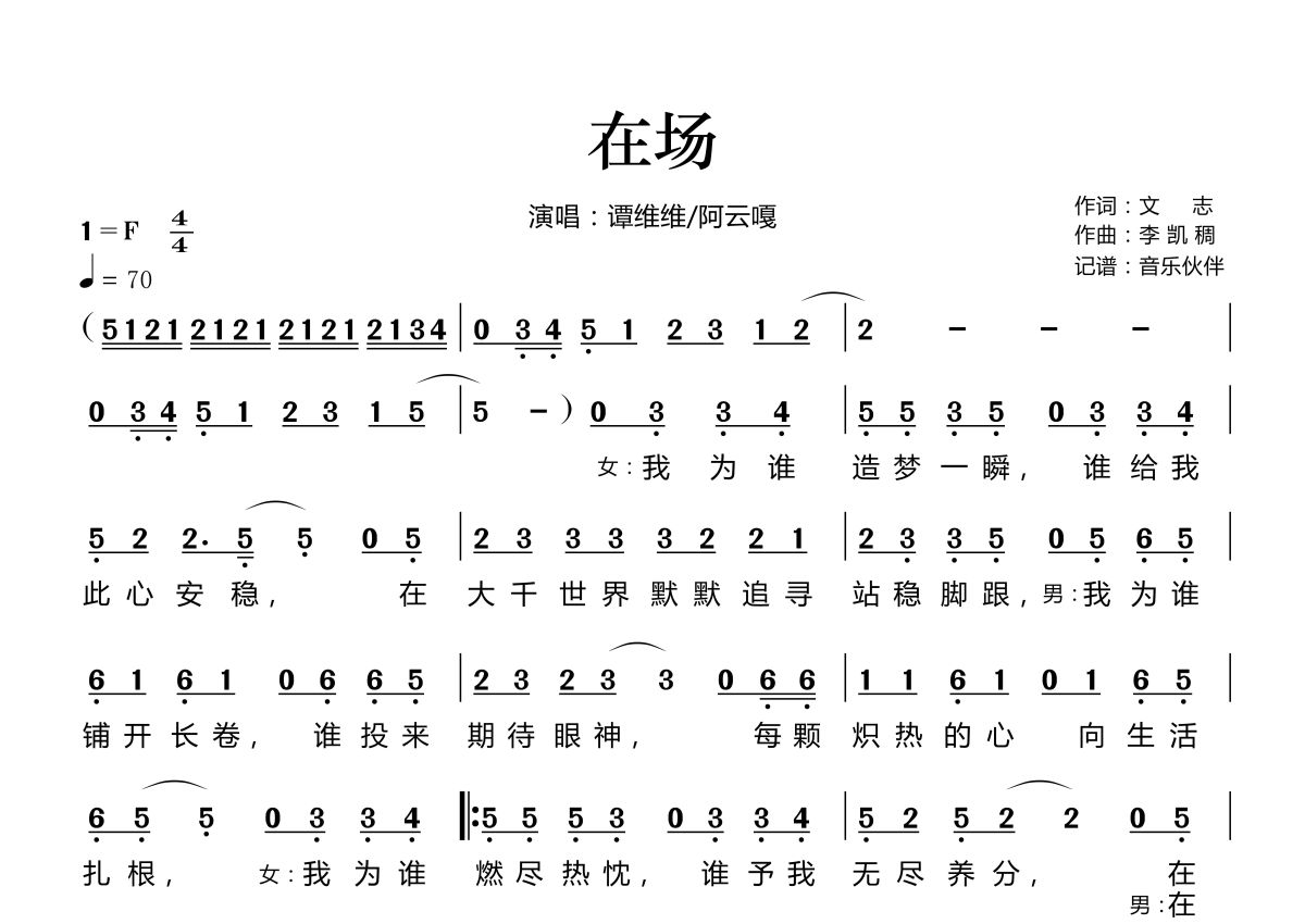 《在场》是谭维维/阿云嘎演唱的一首歌曲,拍号为4/4拍,歌曲速度为每分钟70拍,这份简谱共有两张高清图谱,图谱由 @音乐伙伴 编配上传。