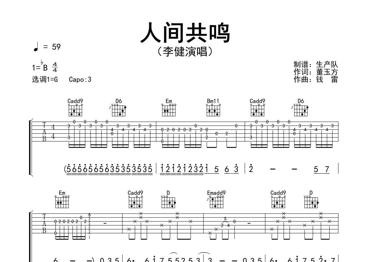 《人间共鸣》是李健演唱的一首歌曲,精编完美版,拍号为4/4拍,歌曲速度为每分钟59拍,歌曲原调为Bb调,但由于原调指法比较难,为了方便弹奏,本吉他谱采用的是G调指法编配,变调夹3品弹奏即为原调,当然也可以根据自己的音域改变变调夹位置,或者通过改变和弦调性,以方便自己弹奏,这份吉他谱共有三张高清图谱,图谱由 @生产队 编配上传,图谱使用六线谱编配,包含吉他和弦指法、简谱以及歌词部分,使用这份人间共鸣吉他谱,可以让你更加方便地掌握这首歌曲的弹唱技巧,快来尝试吧。李健演唱的歌曲《人间共鸣》原版吉他谱,含精准的前奏、间奏、尾奏solo编配,精编完美版,优质推荐!。