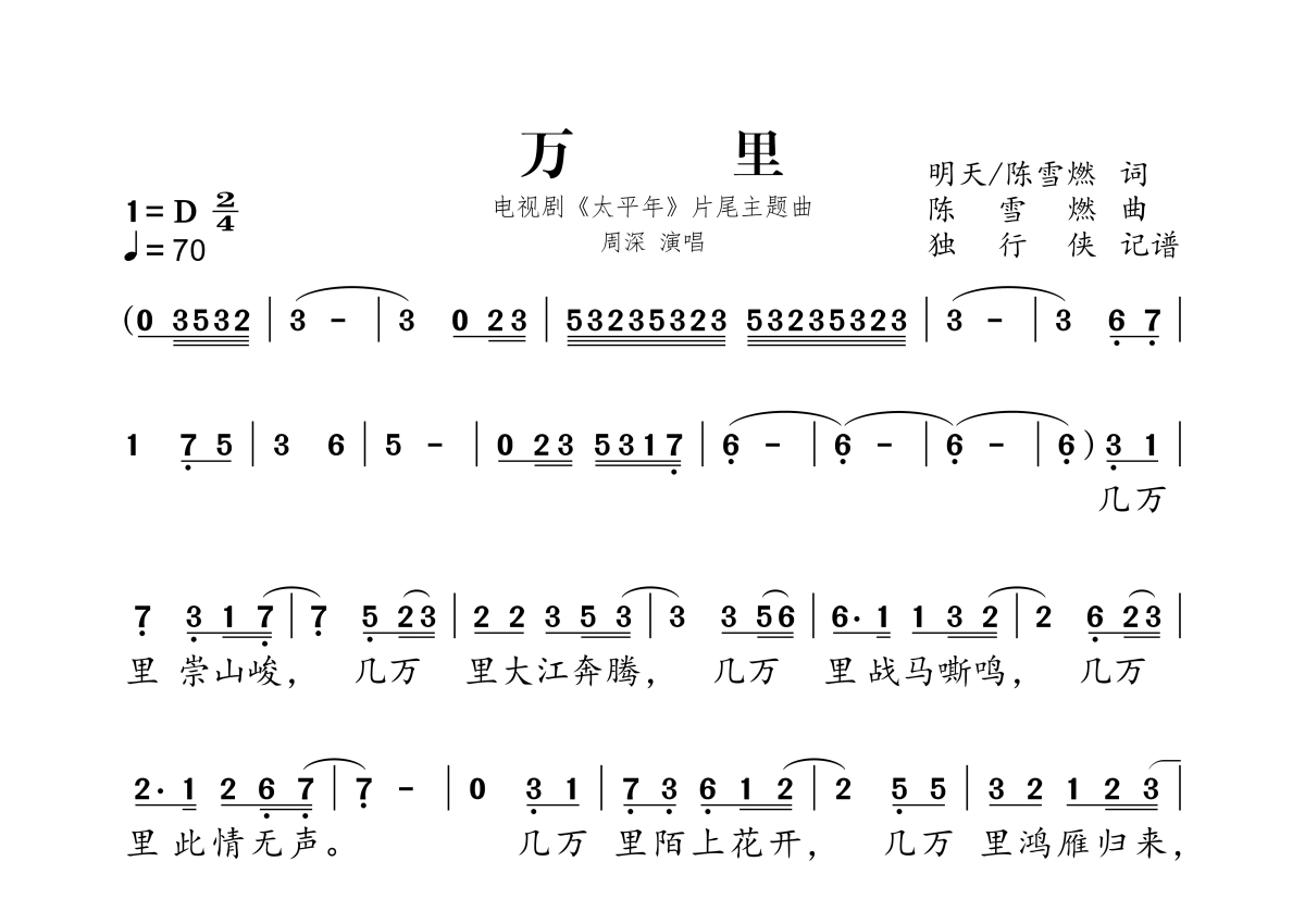 《万里》是周深演唱的一首歌曲,拍号为2/4拍,歌曲速度为每分钟70拍,这份简谱共有两张高清图谱,图谱由 @独行侠 编配上传。