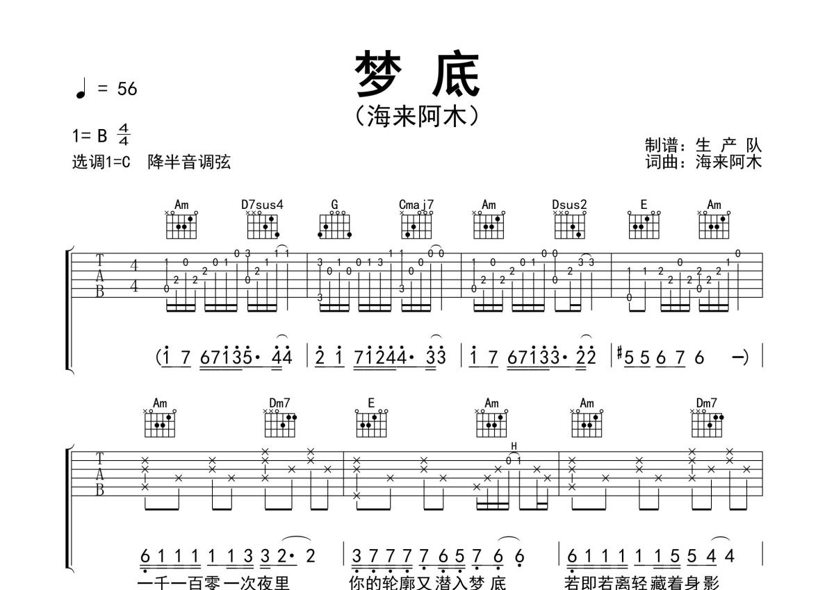 《梦底》是海来阿木演唱的一首歌曲,精编完美版,拍号为4/4拍,歌曲速度为每分钟56拍,歌曲原调为B调,但由于原调指法比较难,为了方便弹奏,本吉他谱采用的是C调指法编配,降半音调弦弹奏即为原调,当然也可以根据自己的音域决定是否调弦,这份吉他谱共有三张高清图谱,图谱由 @生产队 编配上传,图谱使用六线谱编配,包含吉他和弦指法、简谱以及歌词部分,使用这份梦底吉他谱,可以让你更加方便地掌握这首歌曲的弹唱技巧,快来尝试吧。海来阿木作词、作曲并演唱的歌曲《梦底》原版吉他谱,含精准的前奏、间奏solo编配,精编完美版,优质推荐!。