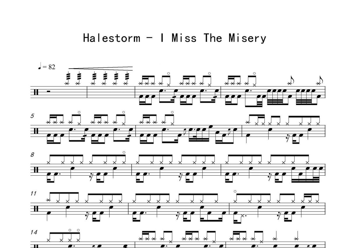 《I Miss The Misery》是Halestorm演唱的一首歌曲,拍号为4/4拍,歌曲速度为每分钟82拍,这份架子鼓谱共有两张高清图谱,图谱由 @音符喷血者 编配上传,图谱使用五线谱编配,使用这份I Miss The Misery架子鼓谱,你将能够轻松地敲打出这首Halestorm的I Miss The Misery,快来尝试吧。