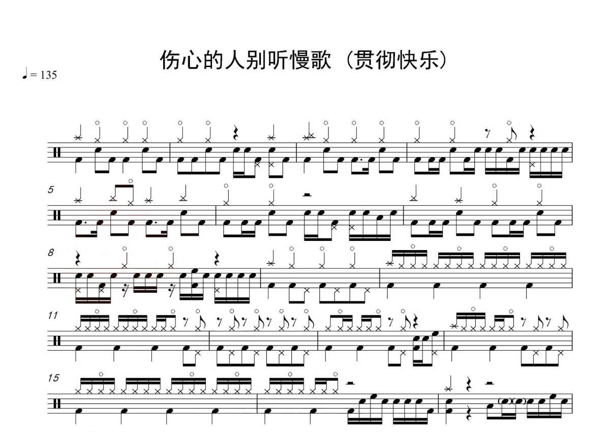 《伤心的人別听慢歌(贯彻快乐)》是五月天演唱的一首歌曲,拍号为4/4拍,歌曲速度为每分钟135拍,这份架子鼓谱共有三张高清图谱,图谱由 @音符喷血者 编配上传,图谱使用五线谱编配,使用这份伤心的人別听慢歌(贯彻快乐)架子鼓谱,你将能够轻松地敲打出这首五月天的伤心的人別听慢歌(贯彻快乐),快来尝试吧。