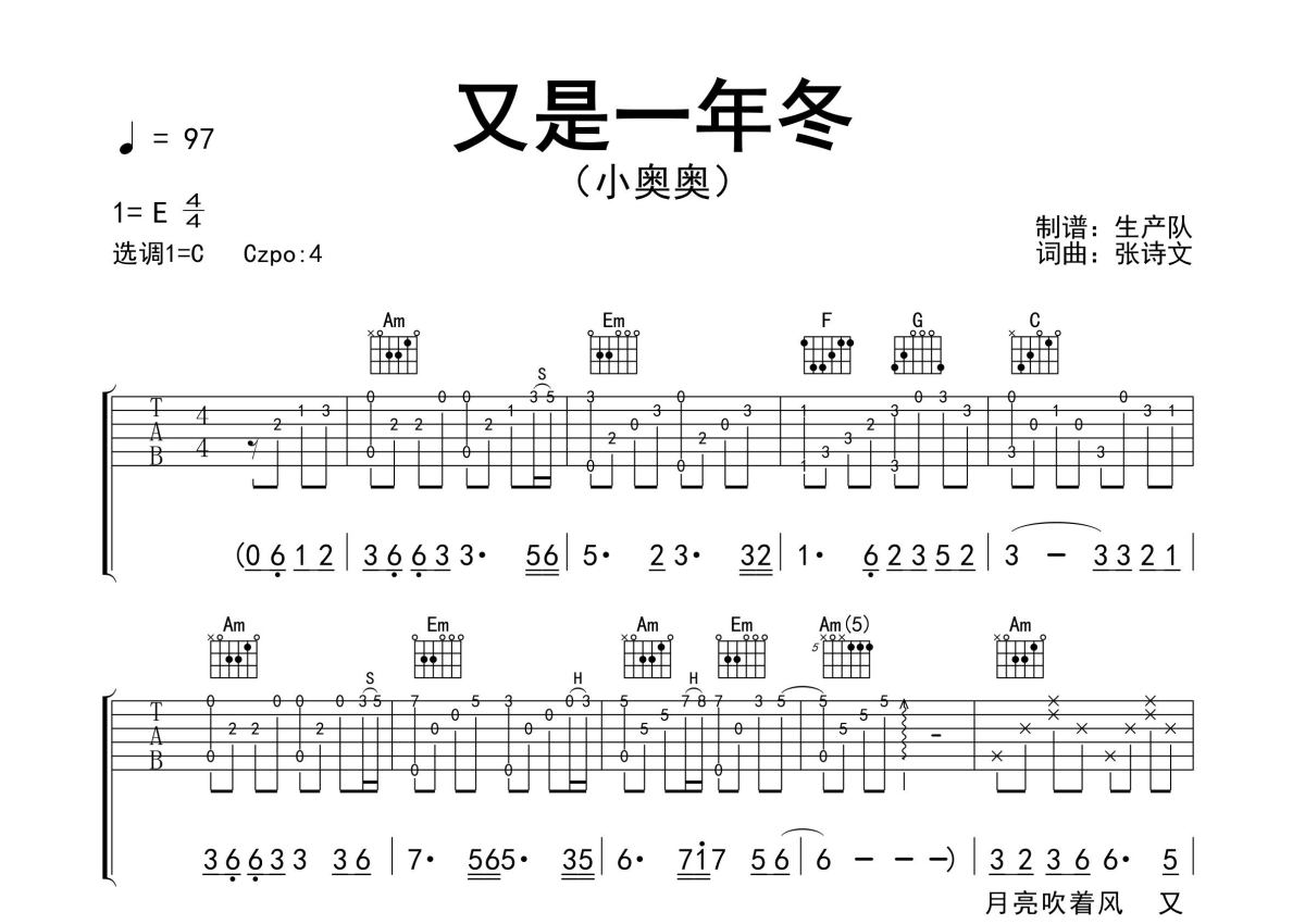 《又是一年冬》是小奥奥演唱的一首歌曲,精编完美版,拍号为4/4拍,歌曲速度为每分钟97拍,歌曲原调为E调,但由于原调指法比较难,为了方便弹奏,本吉他谱采用的是C调指法编配,变调夹4品弹奏即为原调,当然也可以根据自己的音域改变变调夹位置,或者通过改变和弦调性,以方便自己弹奏,这份吉他谱共有三张高清图谱,图谱由 @生产队 编配上传,图谱使用六线谱编配,包含吉他和弦指法、简谱以及歌词部分,使用这份又是一年冬吉他谱,可以让你更加方便地掌握这首歌曲的弹唱技巧,快来尝试吧。小奥奥演唱的歌曲《又是一年冬》原版吉他谱,含精准的前奏、间奏、尾奏solo编配,精编完美版,优质推荐!。