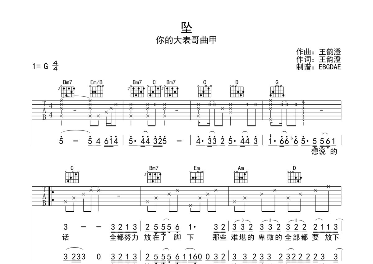 《坠》是你的大表哥曲甲演唱的一首歌曲,本吉他谱采用的是G调指法编配,这份吉他谱共有三张高清图谱,图谱由 @EBGDAE 编配上传,图谱使用六线谱编配,包含吉他和弦指法、简谱以及歌词部分,使用这份坠吉他谱,可以让你更加方便地掌握这首歌曲的弹唱技巧,快来尝试吧。原版编配,物美价廉,放心选购!加油!。