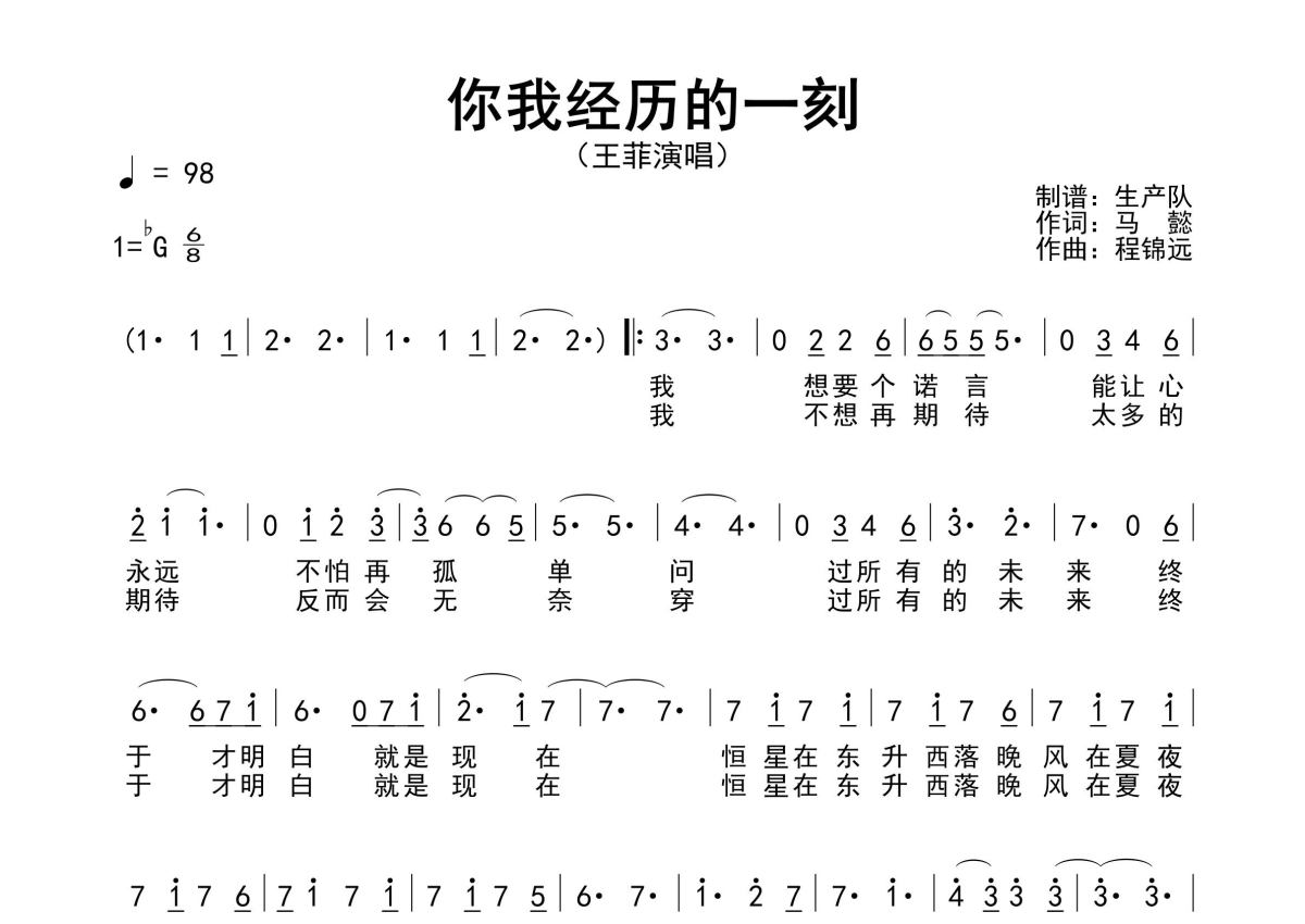 《你我经历的一刻》是王菲演唱的一首歌曲,原版简谱,拍号为6/8拍,歌曲速度为每分钟98拍,这份简谱共有一张高清图谱,图谱由 @生产队 编配上传王菲演唱的歌曲《你我经历的一刻》原版简谱,含精准的前奏、间奏、尾奏solo编配,精编完美版,优质推荐!。