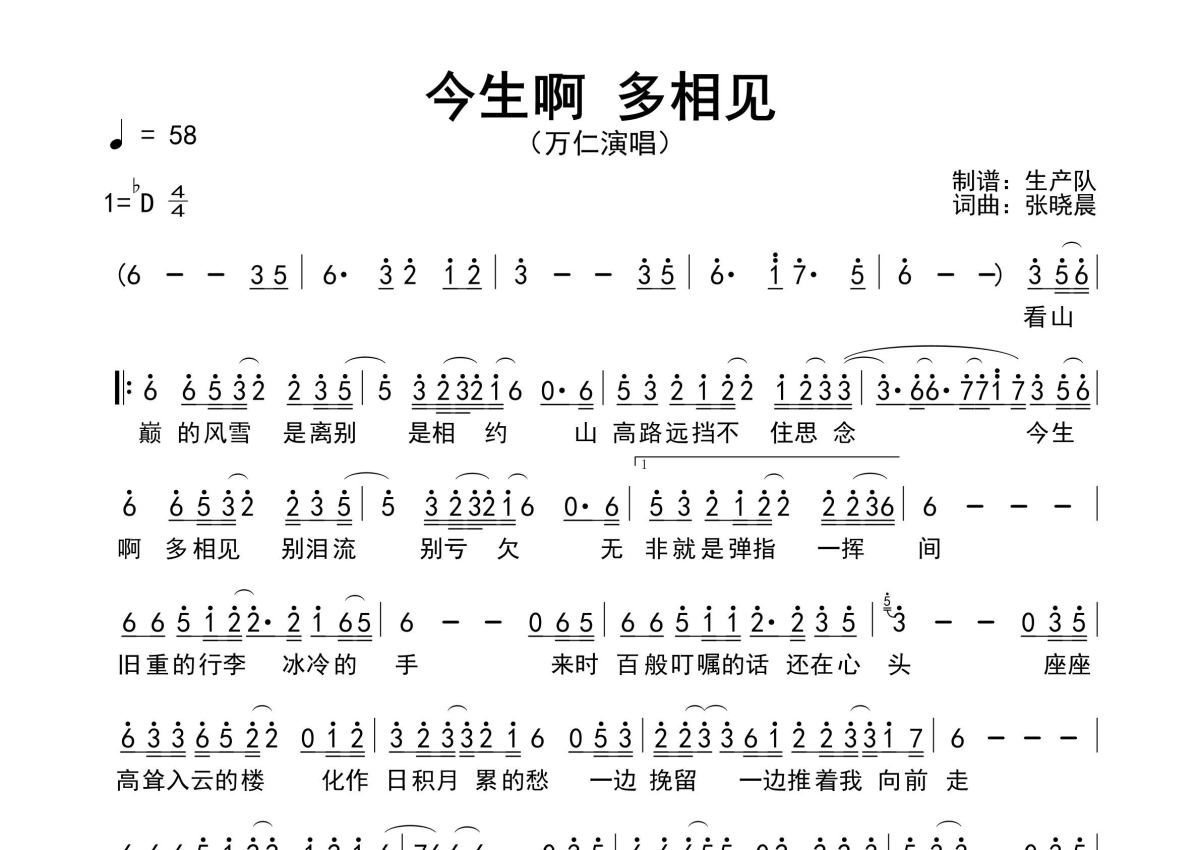 《今生啊 多相见》是万仁演唱的一首歌曲,原版简谱,拍号为4/4拍,歌曲速度为每分钟58拍,这份简谱共有一张高清图谱,图谱由 @生产队 编配上传万仁演唱的歌曲《今生啊 多相见》原版简谱,含精准的前奏、间奏、尾奏solo编配,精编完美版,优质推荐!。
