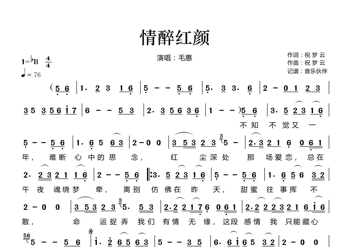 《情醉红颜》是毛惠演唱的一首歌曲,拍号为4/4拍,歌曲速度为每分钟76拍,这份简谱共有一张高清图谱,图谱由 @音乐伙伴 编配上传。