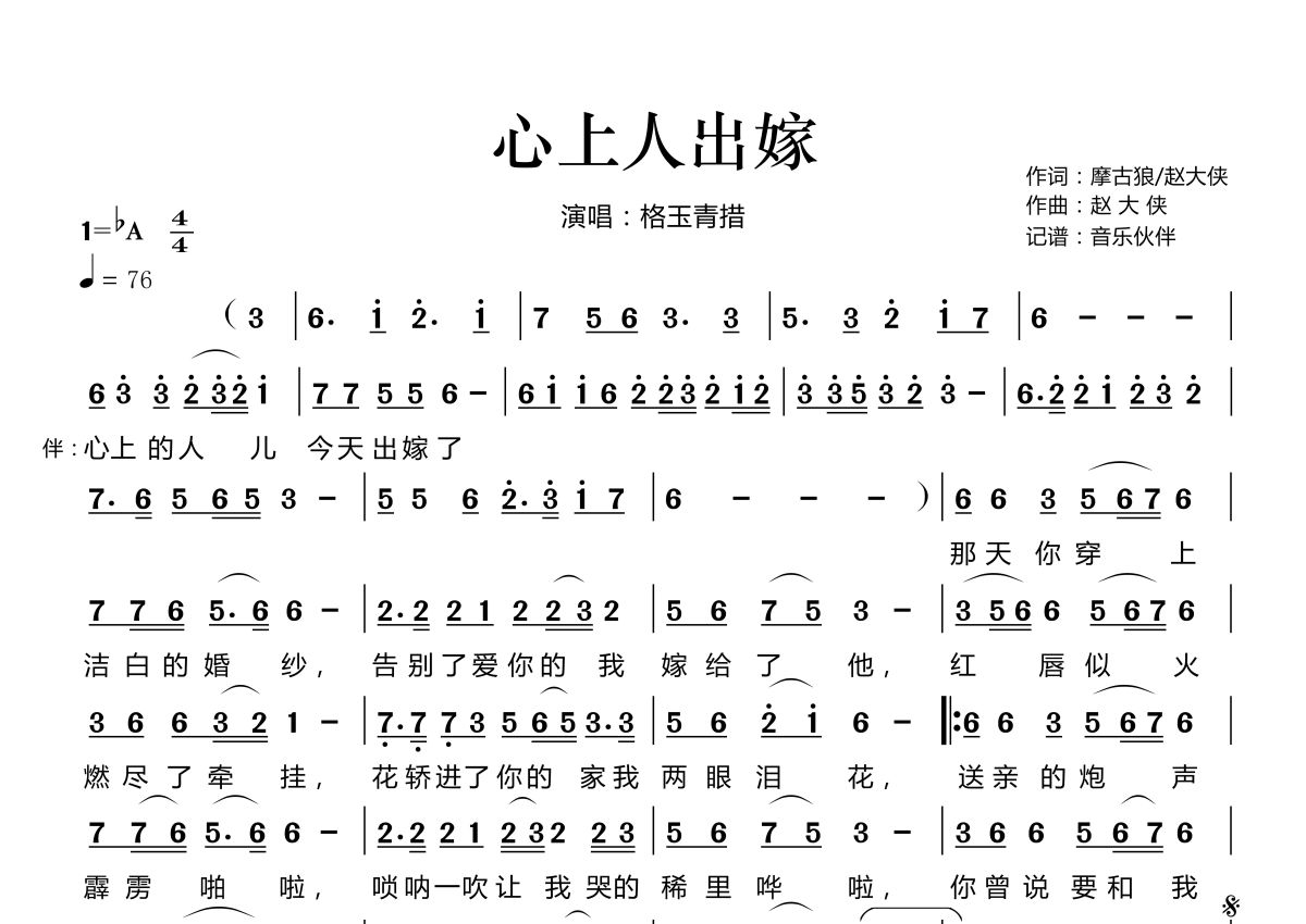 《心上人出嫁》是格玉青措演唱的一首歌曲,拍号为4/4拍,歌曲速度为每分钟76拍,这份简谱共有一张高清图谱,图谱由 @音乐伙伴 编配上传。