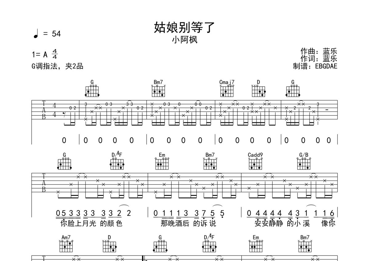 《姑娘别等了》是小阿枫演唱的一首歌曲,本吉他谱采用的是G调指法编配,这份吉他谱共有两张高清图谱,图谱由 @EBGDAE 编配上传,图谱使用六线谱编配,包含吉他和弦指法、简谱以及歌词部分,使用这份姑娘别等了吉他谱,可以让你更加方便地掌握这首歌曲的弹唱技巧,快来尝试吧。2张谱,免翻页排版设计。物美价廉,放心选购!加油!。