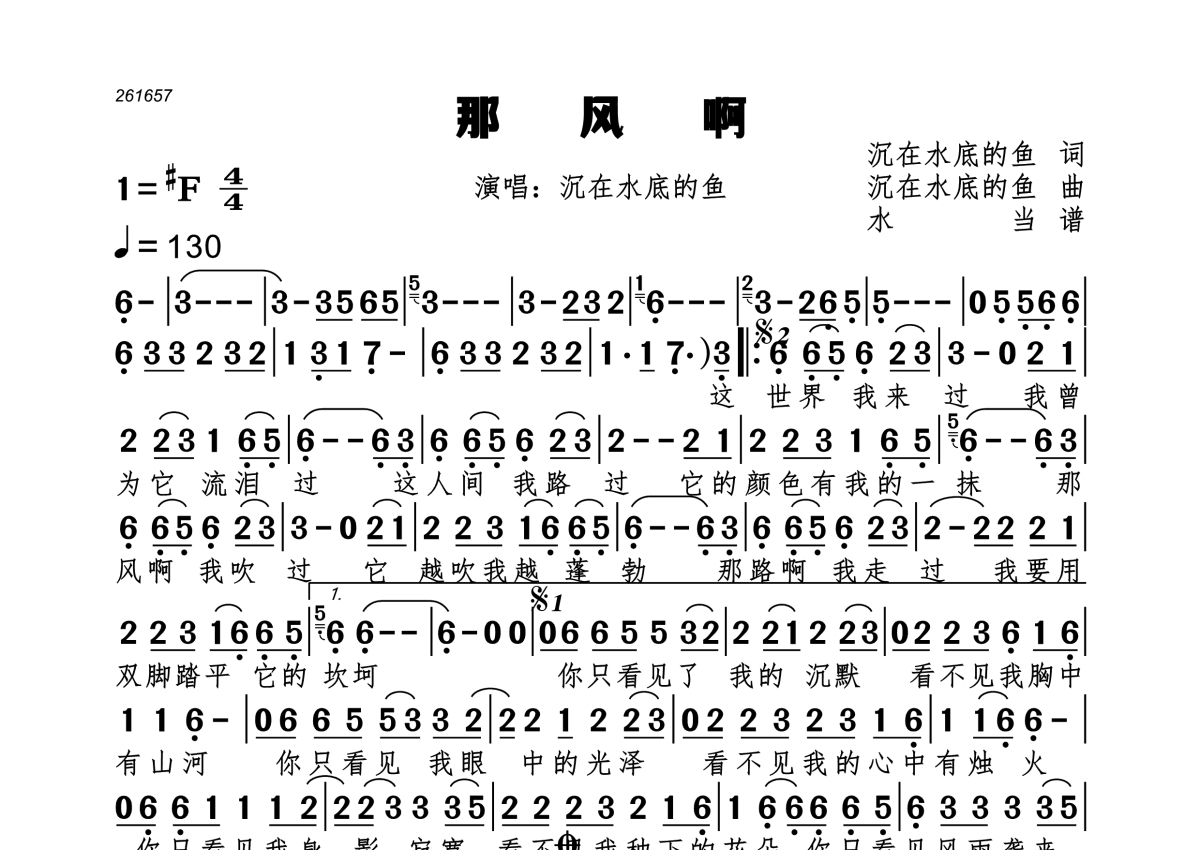 《那风啊》是沉在水底的鱼演唱的一首歌曲,拍号为4/4拍,歌曲速度为每分钟130拍,这份简谱共有一张高清图谱,图谱由 @水当 编配上传。