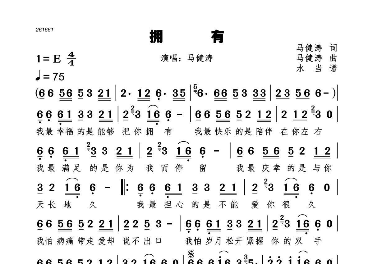 《拥有》是马健涛演唱的一首歌曲,拍号为4/4拍,歌曲速度为每分钟75拍,这份简谱共有一张高清图谱,图谱由 @水当 编配上传。