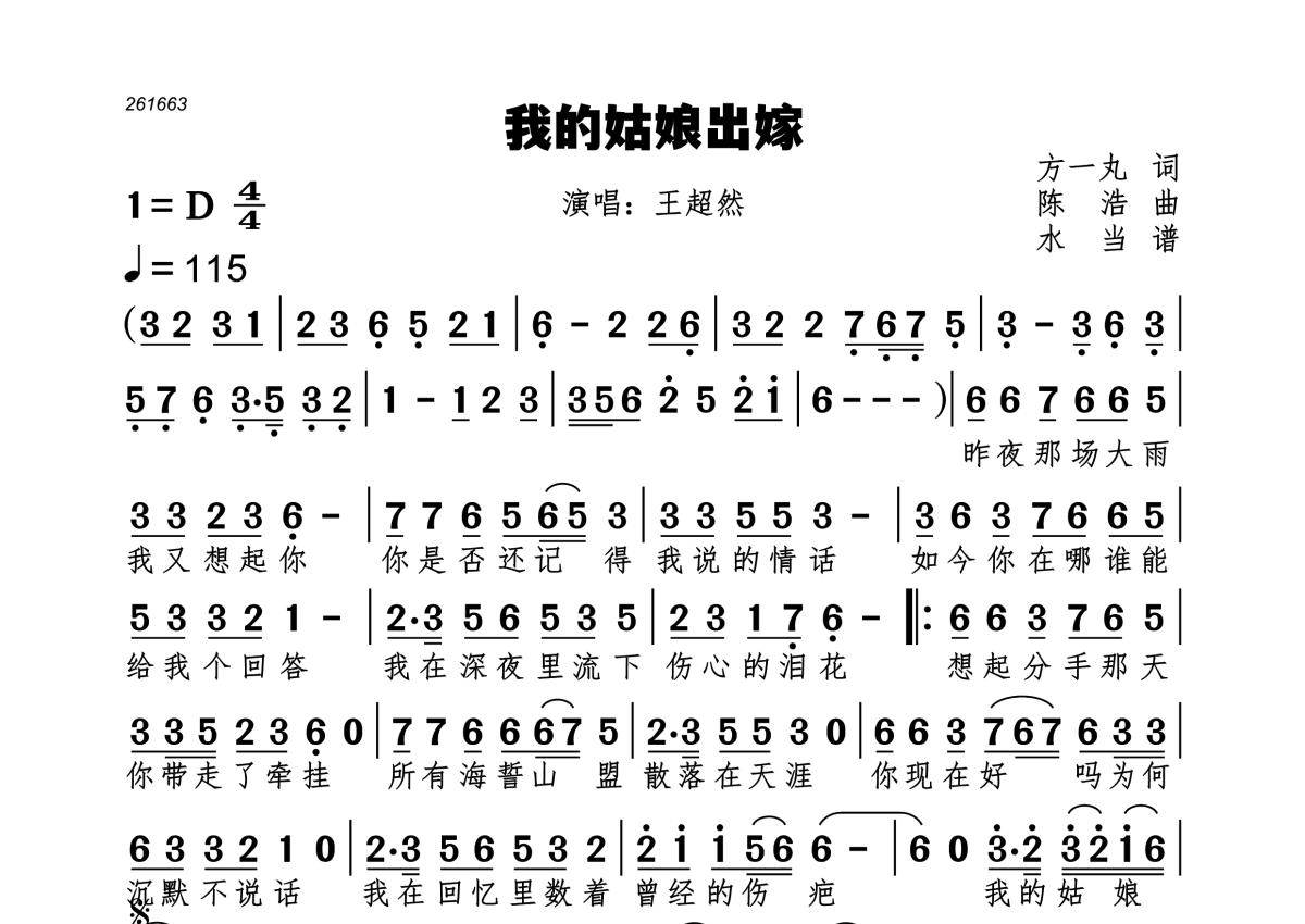《我的姑娘出嫁》是王超然演唱的一首歌曲,拍号为4/4拍,歌曲速度为每分钟115拍,这份简谱共有一张高清图谱,图谱由 @水当 编配上传。