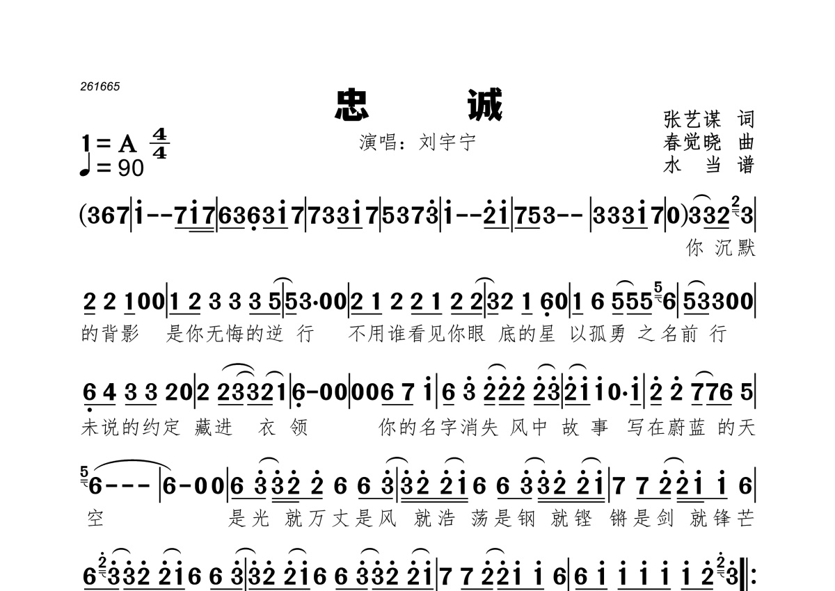 《忠诚》是刘宇宁演唱的一首歌曲,拍号为4/4拍,歌曲速度为每分钟90拍,这份简谱共有一张高清图谱,图谱由 @水当 编配上传。