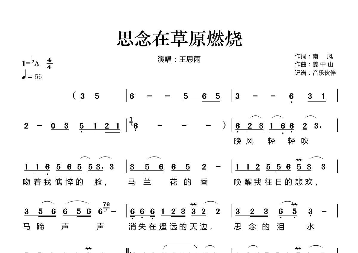 思念在草原燃烧简谱 - 王思雨演唱