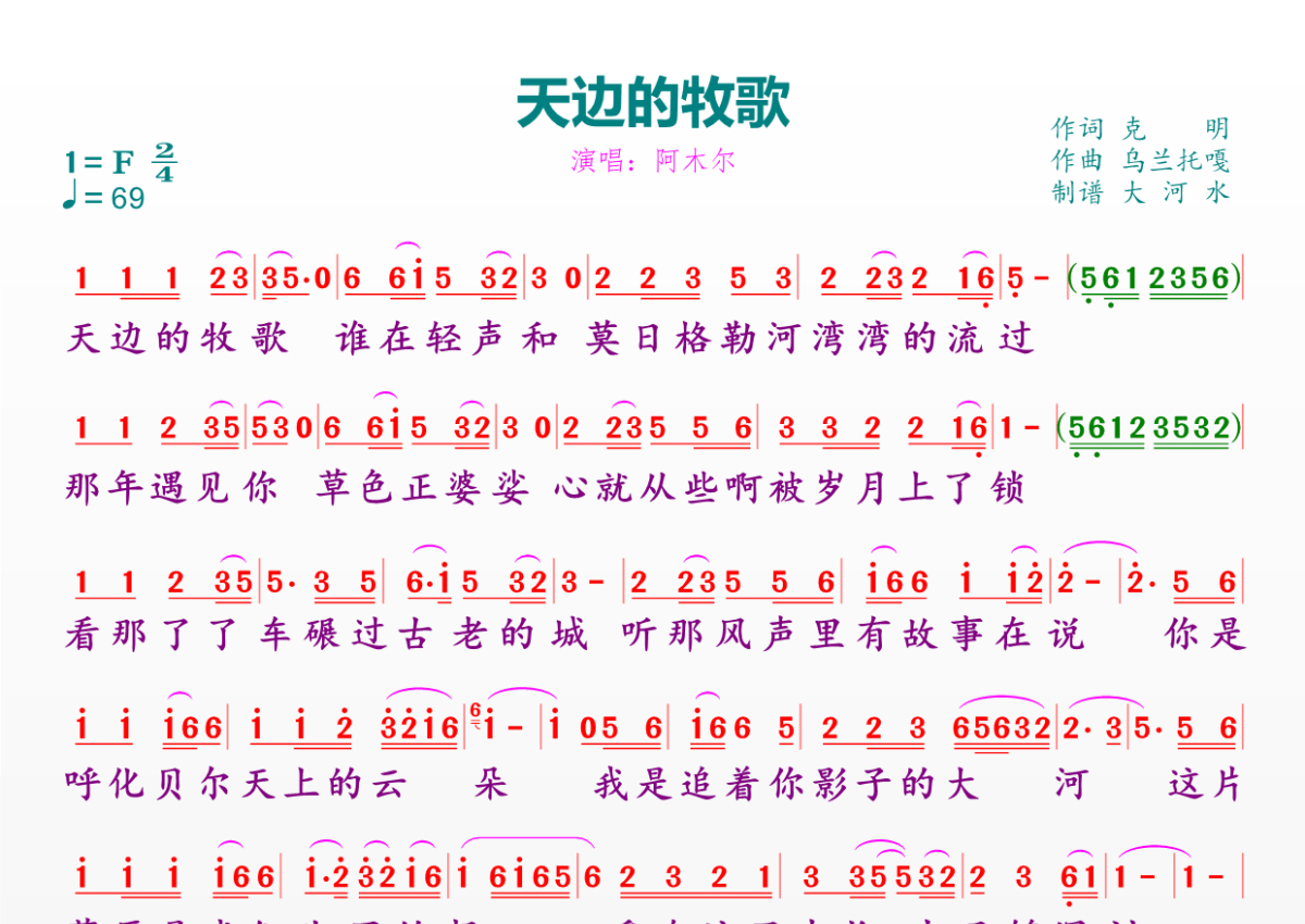 《天边的牧歌》是阿木尔演唱的一首歌曲,拍号为4/4拍,歌曲速度为每分钟69拍,这份简谱共有一张高清图谱,图谱由 @临海雪原 编配上传。