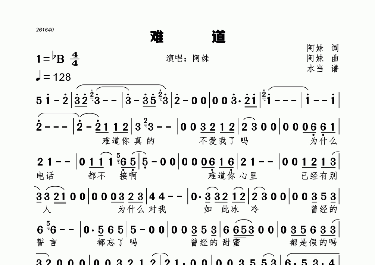 《难道》是阿妹演唱的一首歌曲,拍号为4/4拍,歌曲速度为每分钟128拍,这份简谱共有两张高清图谱,图谱由 @水当 编配上传。