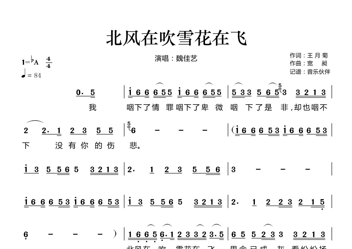 《北风在吹雪花在飞》是魏佳艺演唱的一首歌曲,拍号为4/4拍,歌曲速度为每分钟84拍,这份简谱共有两张高清图谱,图谱由 @音乐伙伴 编配上传。
