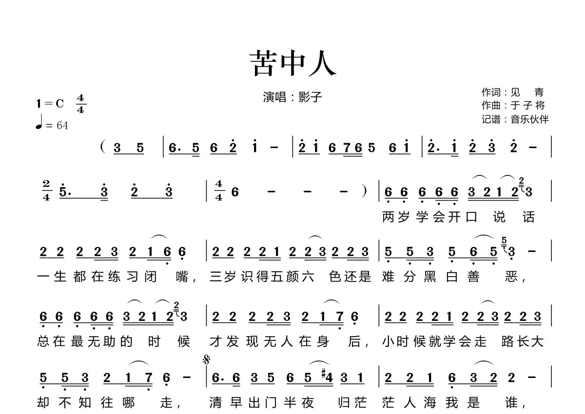 《苦中人》是影子演唱的一首歌曲,拍号为4/4拍,歌曲速度为每分钟64拍,这份简谱共有一张高清图谱,图谱由 @音乐伙伴 编配上传。