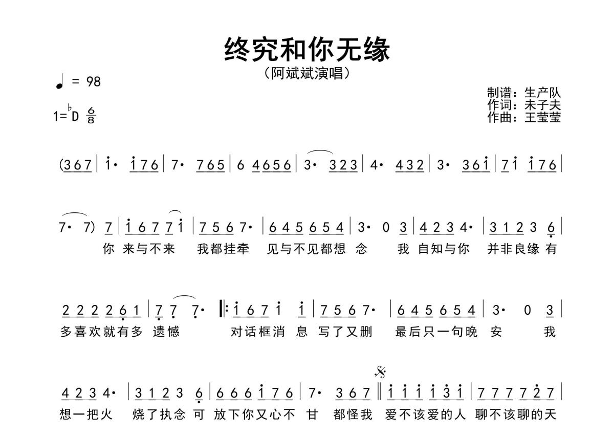 《终究和你无缘》是阿斌斌演唱的一首歌曲,原版简谱,拍号为6/8拍,歌曲速度为每分钟98拍,这份简谱共有一张高清图谱,图谱由 @生产队 编配上传阿斌斌演唱的歌曲《终究和你无缘》原版简谱,含精准的前奏、间奏、尾奏solo编配,精编完美版,优质推荐!。