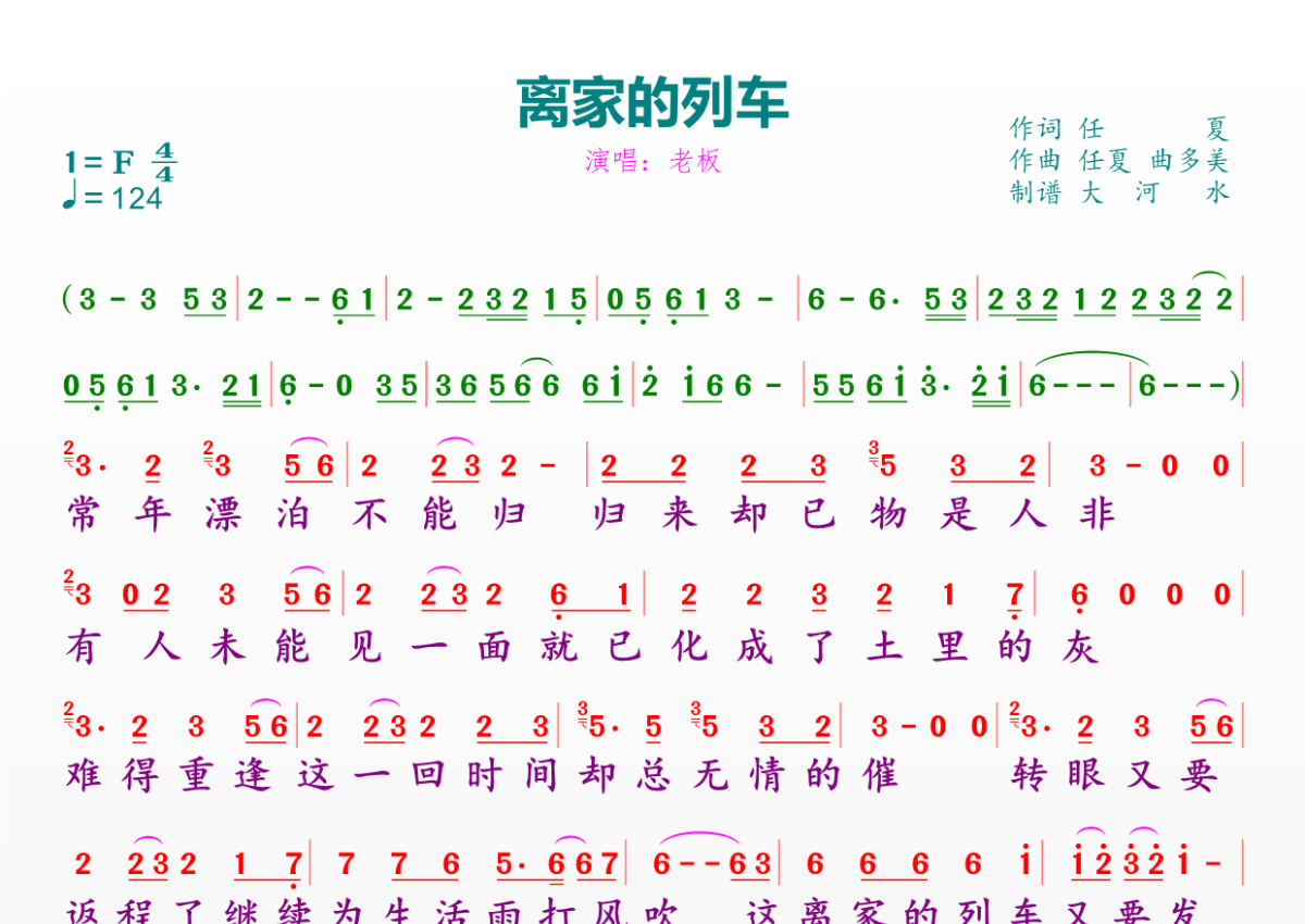 《离家的列车》是老板演唱的一首歌曲,拍号为4/4拍,歌曲速度为每分钟124拍,这份简谱共有一张高清图谱,图谱由 @临海雪原 编配上传。