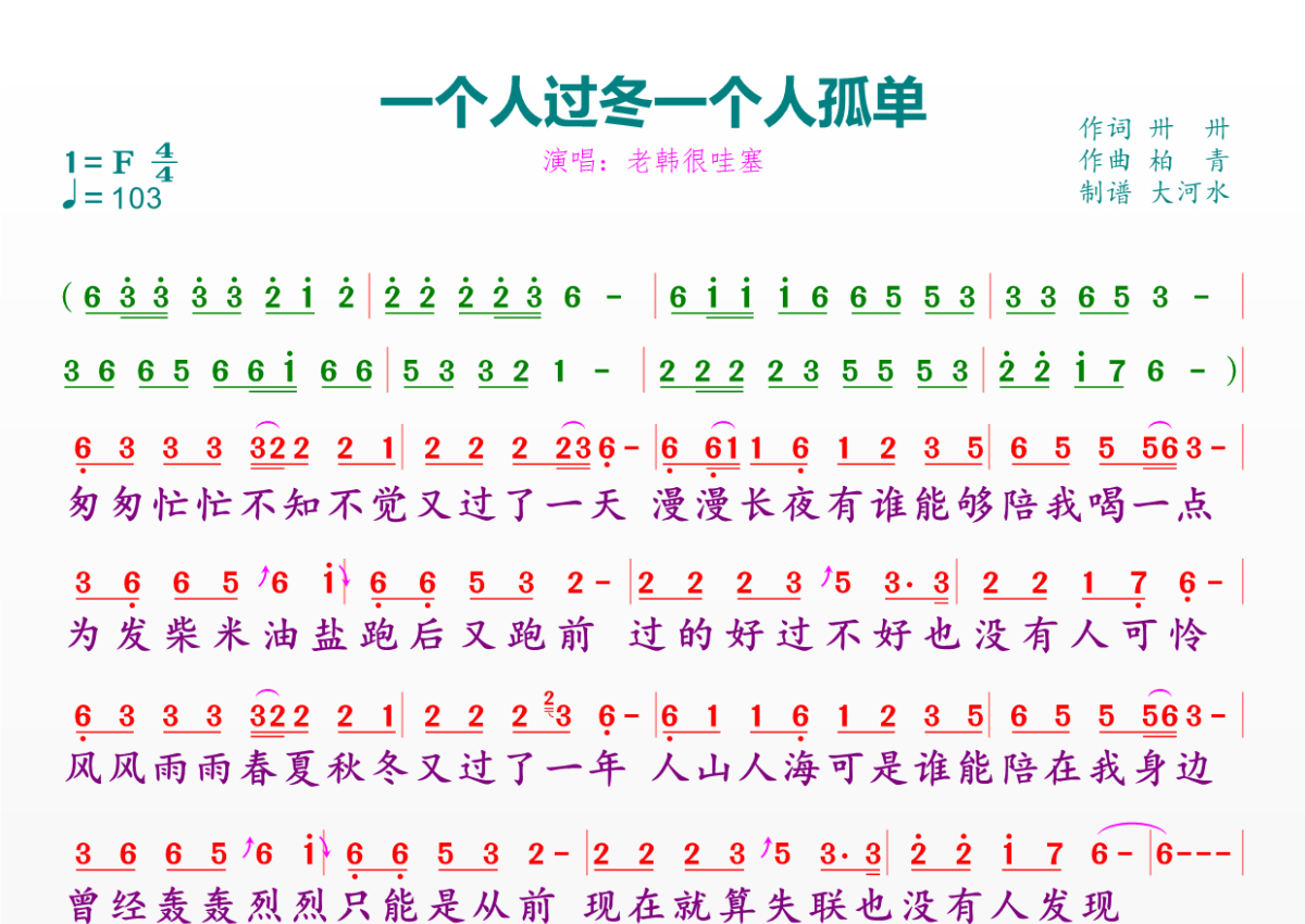 《一个人过冬一个人孤单》是老韩很哇塞演唱的一首歌曲,拍号为4/4拍,歌曲速度为每分钟103拍,这份简谱共有一张高清图谱,图谱由 @临海雪原 编配上传。