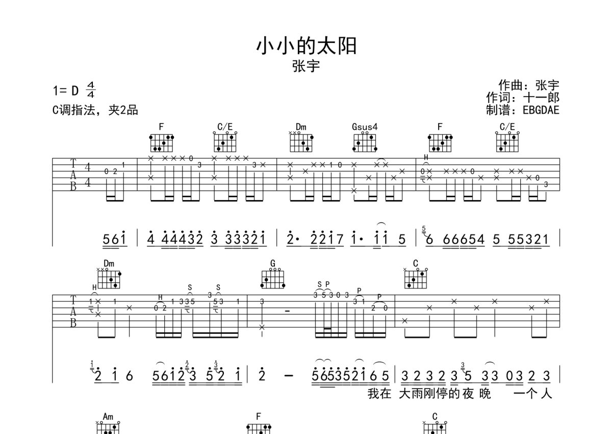 张宇《小小的太阳》吉他谱 - C调弹唱六线谱