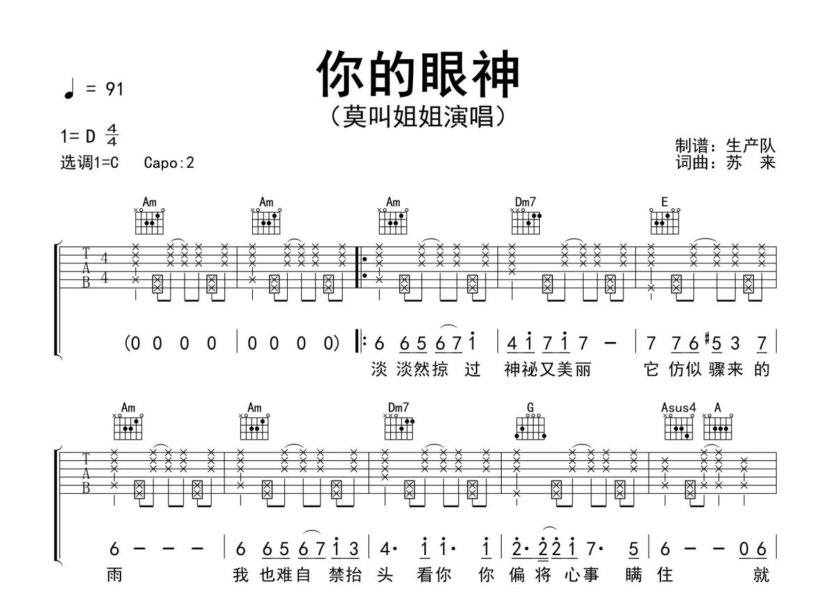 《你的眼神(粤语版)》是粤语版演唱的一首歌曲,精编完美版,拍号为4/4拍,歌曲速度为每分钟91拍,歌曲原调为D调,但由于原调指法比较难,为了方便弹奏,本吉他谱采用的是C调指法编配,变调夹2品弹奏即为原调,当然也可以根据自己的音域改变变调夹位置,或者通过改变和弦调性,以方便自己弹奏,这份吉他谱共有两张高清图谱,图谱由 @生产队 编配上传,图谱使用六线谱编配,包含吉他和弦指法、简谱以及歌词部分,使用这份你的眼神(粤语版)吉他谱,可以让你更加方便地掌握这首歌曲的弹唱技巧,快来尝试吧。莫叫姐姐演唱的歌曲《你的眼神(粤语版)》原版吉他谱,含精准的前奏、间奏编配,精编完美版,优质推荐!。