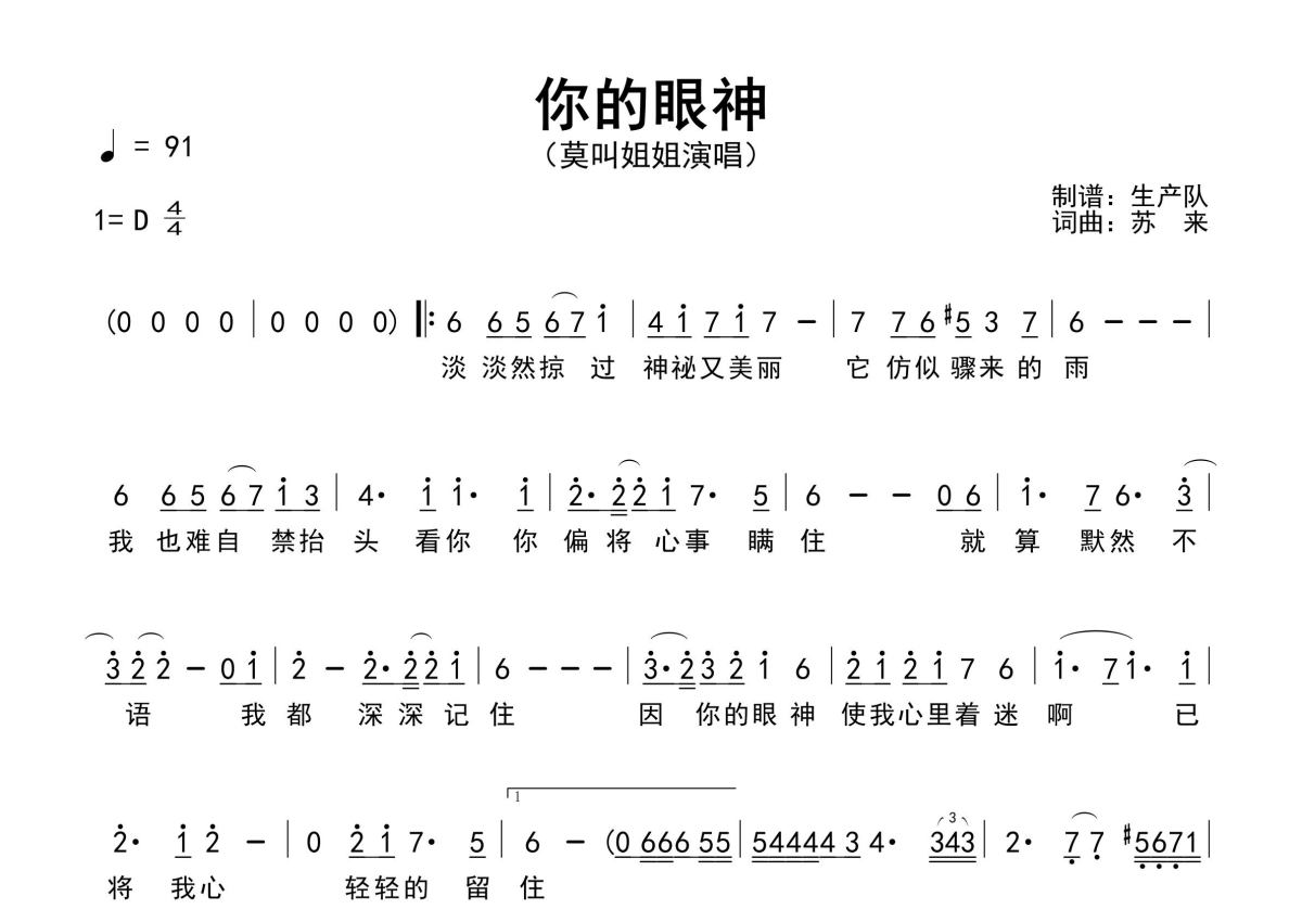 《你的眼神(粤语版)》是粤语版演唱的一首歌曲,原版简谱,拍号为4/4拍,歌曲速度为每分钟91拍,这份简谱共有一张高清图谱,图谱由 @生产队 编配上传莫叫姐姐演唱的歌曲《你的眼神(粤语版)》原版简谱,含精准的前奏、间奏编配,精编完美版,优质推荐!。